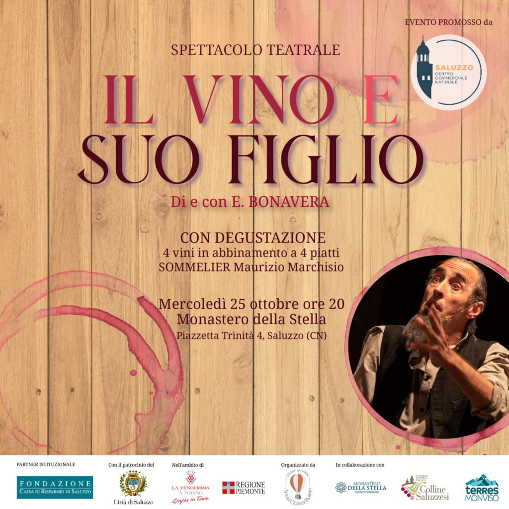 Degustazione guidata dal sommelier Maurizio Marchisio di 4 vini (di cui 2 del Consorzio Vini colline Saluzzesi) abbinati a 4 piatti, intervallata da un monologo teatrale comico interpretato dal magistrale Enrico Bonavera.